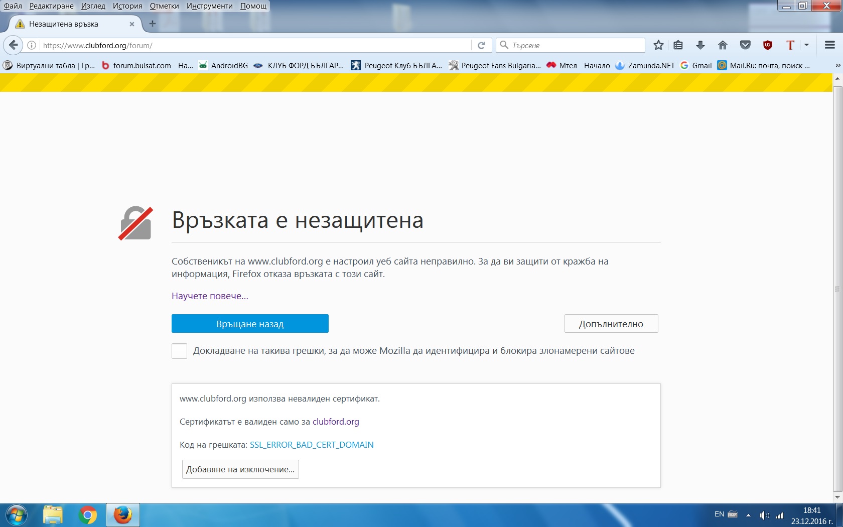 липсва сертификат може да ви откраднат данните. въпреки изричните ми съгласия да продължи не ми зарежда. на лаптопа с лисичката нямам проблем
