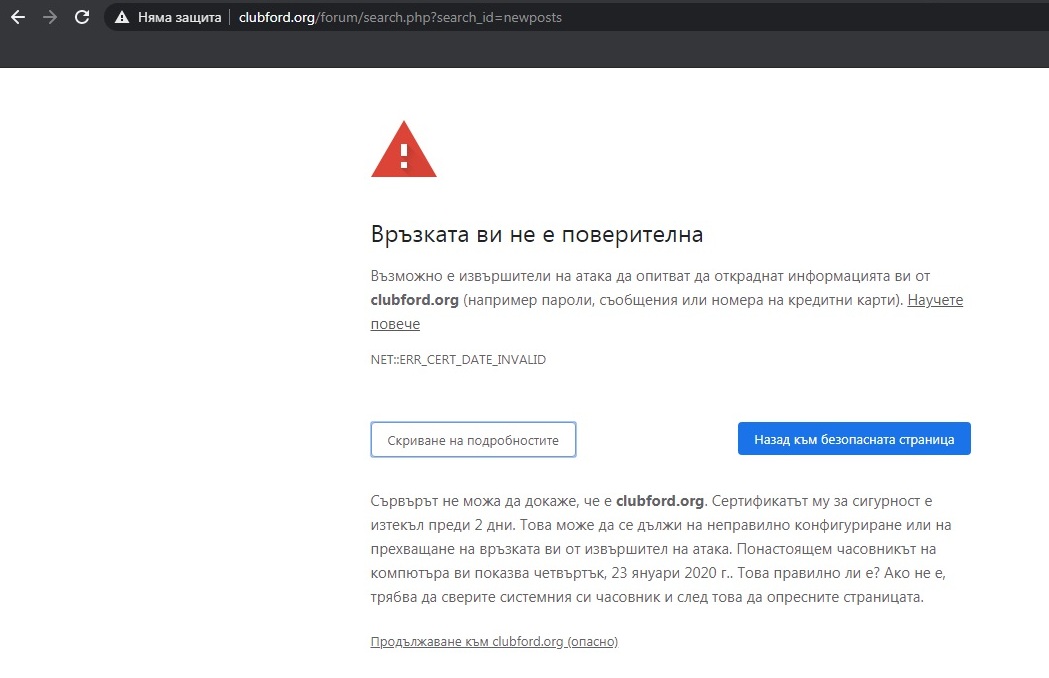 Вчера и днес, при първоначалното зареждане на страницата извежда съобщение, че е изтекъл сертификата за сигурност и след зареждане на страницата, в началото на адресната лента извежда "Няма защита".