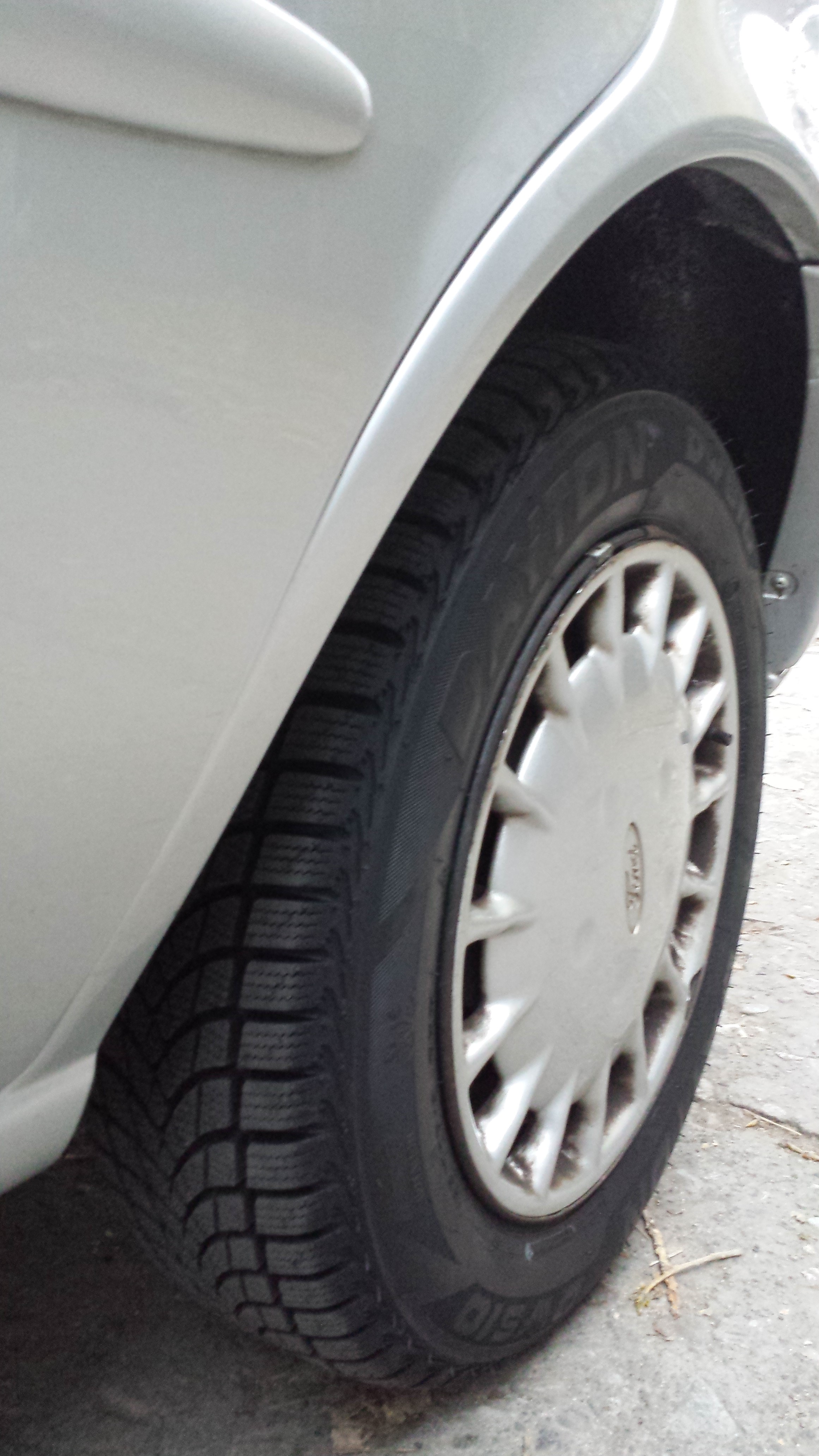 - Купени и сложени 4 чисто нови, зимни гуми от магазина - Дайтон ( произвеждат се от Бриджстон ) с размер 155 / 70 /13. Монтирах ги на оригиналните, железни джанти, които са с оригинални, заводски тазове на Форд.