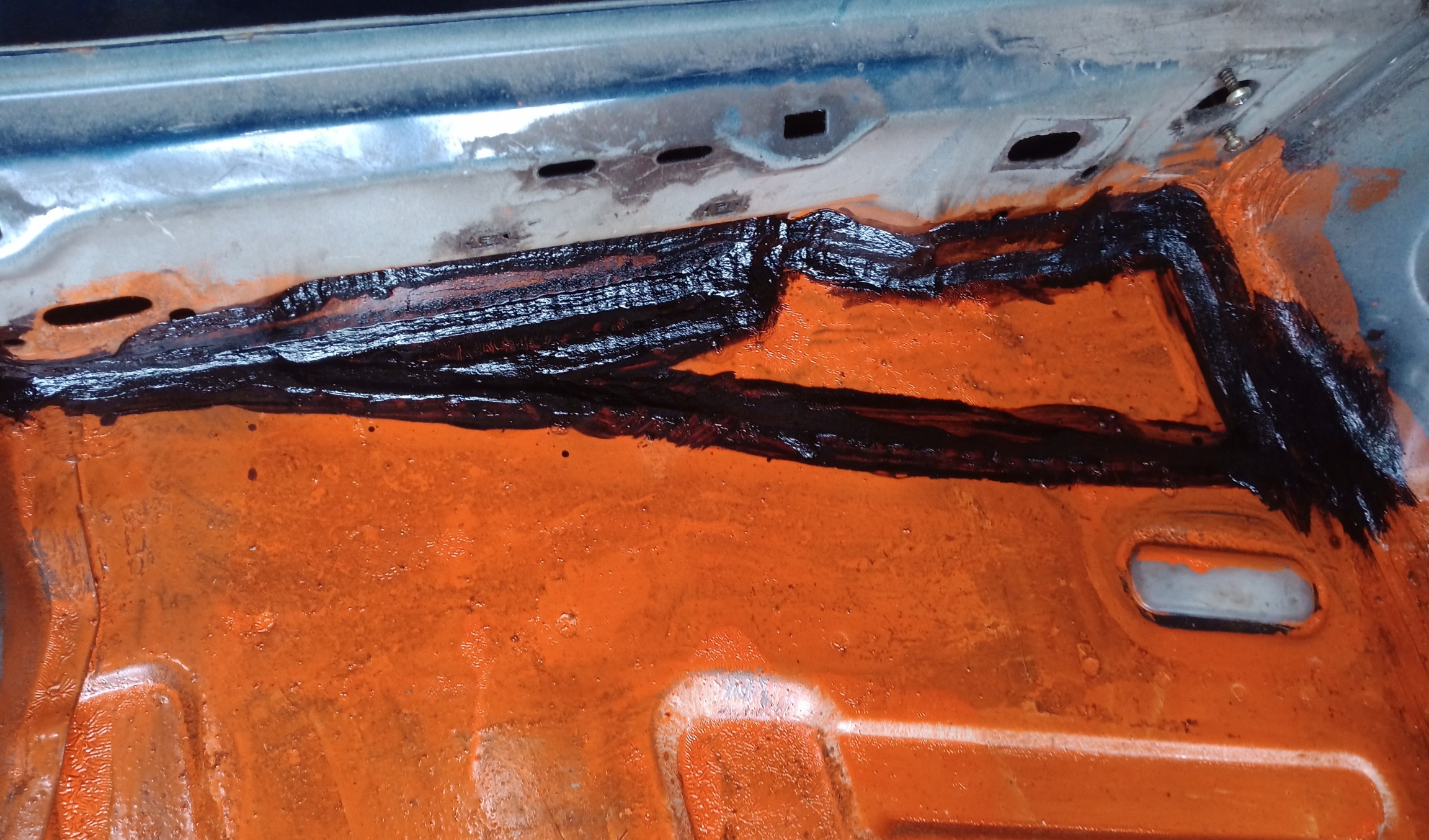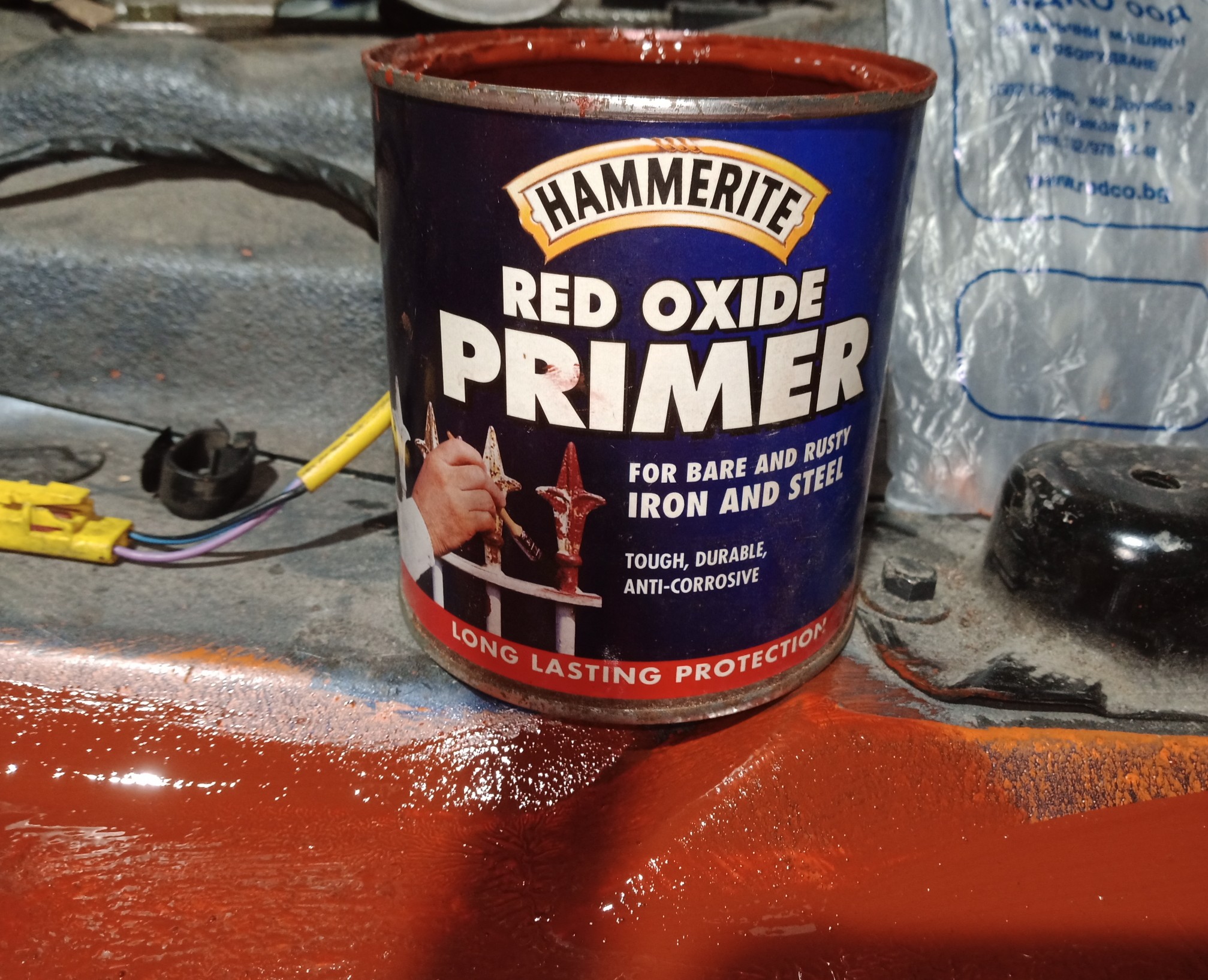 Тъй като купето беше изкърпено от предния собственик, аз се захванах с обработката против ръжда. Като за първи покритие непосредствено върху метала се доверих на стария и доказан във времето оловен миниум. Неговата роля е съществена, тъй като с него се образува слой железен оксид!