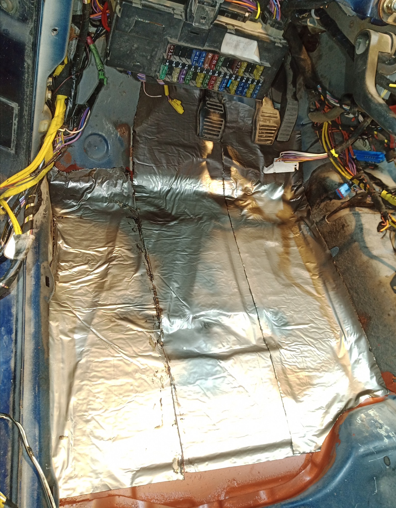 Днес даде време и успях да поработя още по проекта. След още 5ч работа по ел.инсталацията, започнах и поставяне на шумоизолация 20мм по-задните калници. На местата където позволява, поставих двойна изолация - общо 40мм.