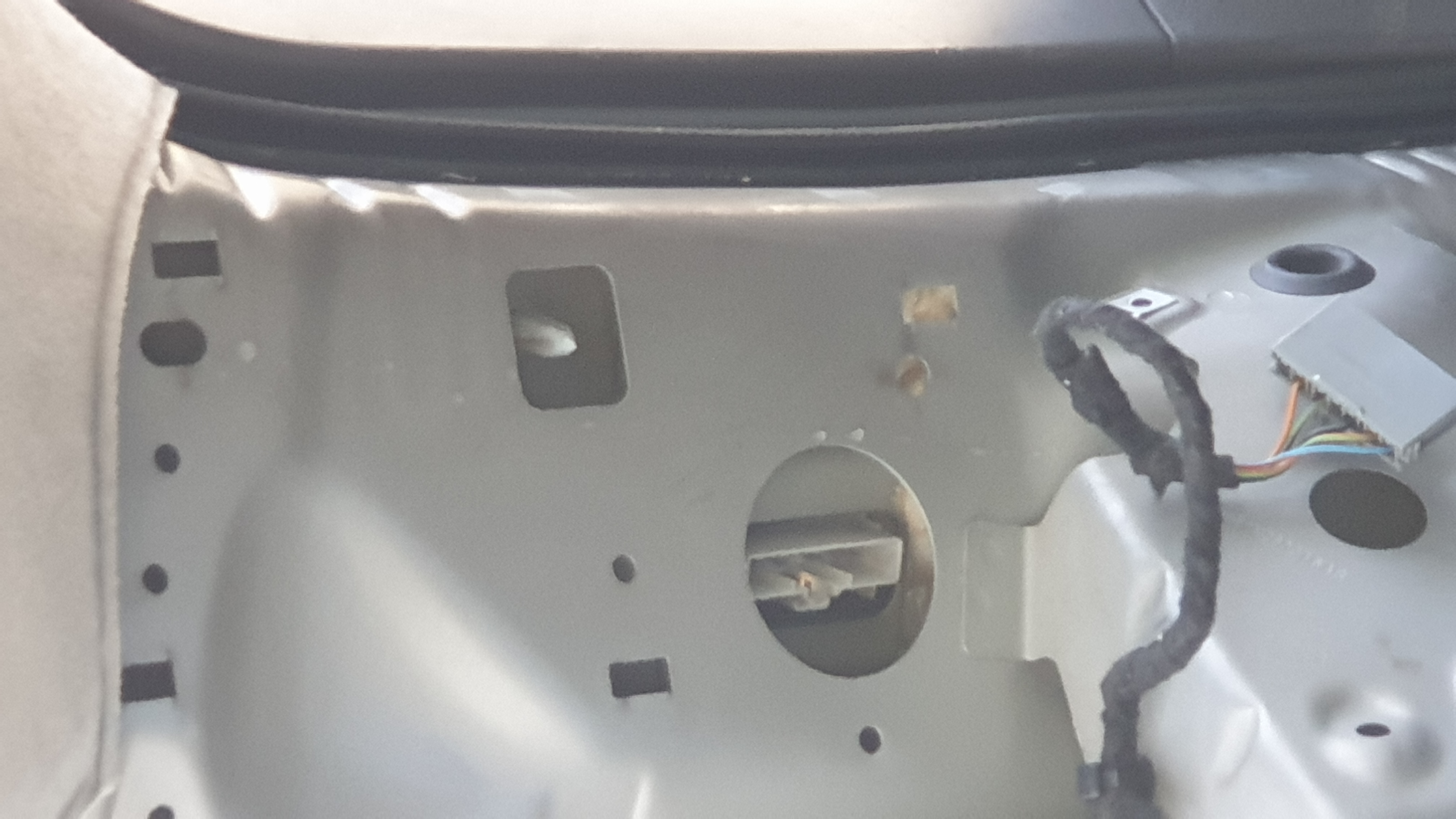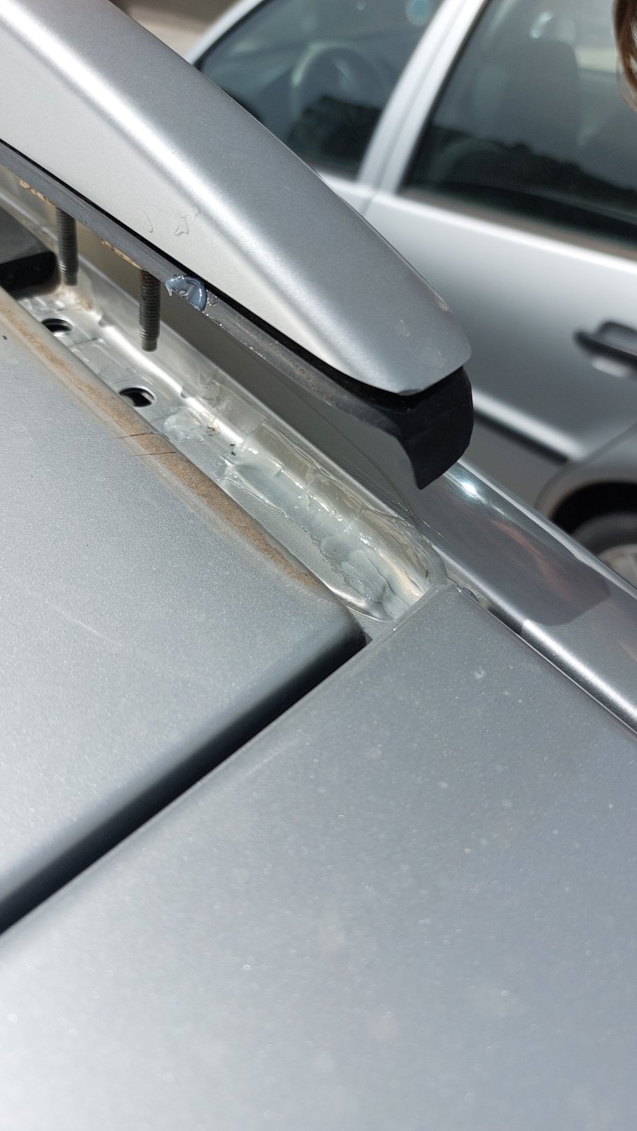 Първото минаване със силикон при мен бе само околко мястото, където се завиват болотовете на стоповете за купето (на снимката). След един дъжд обаче отново влезе вода, макар и по-малко. На второто минаване минах през всички места, където има спойки на ламарините. Освен това сложих малко силикон и на отвора, където се завива болта на стопа - вътре в отвора. Според мен от там също влиза вода ако е по-хлабав и това го няма в никое от видеата. След второто минаване със силикон и обилен дъжд няколко пъти, сега всичко е сухо.