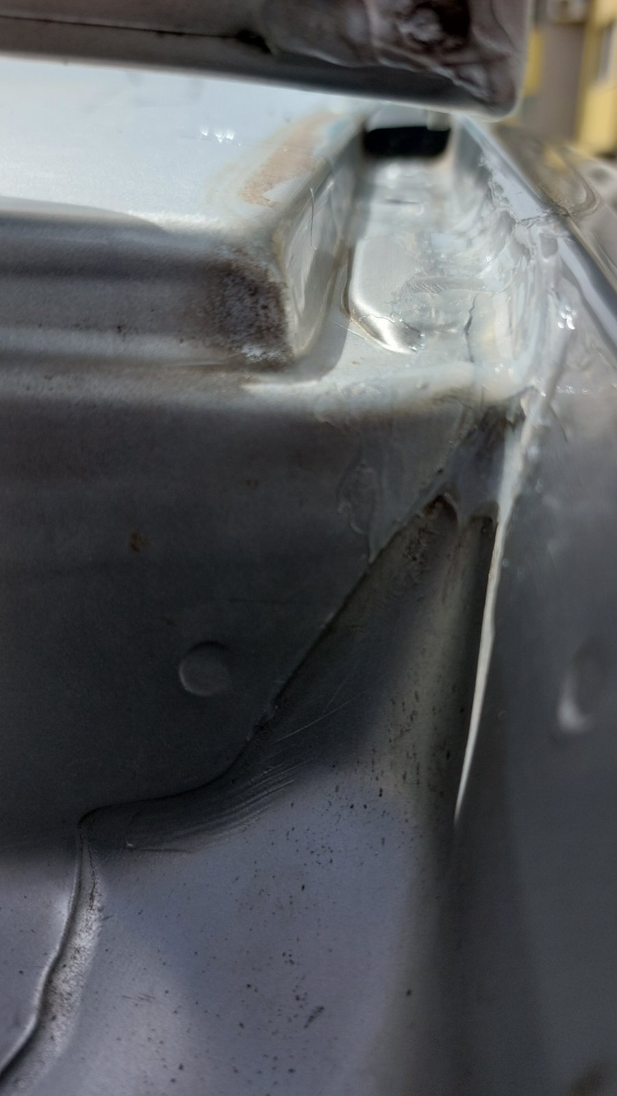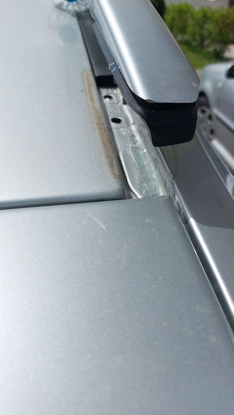 Ами може да се каже, че изиграх хорото. За щастие само частично открехване на тавана и откачане само на задния крепеж на релсата отварят достатъчно място да се третира проблемното място. Използвах поксипол, за да запълня цепнатините в оригиналното лепило. Според мен ще придаде якост и със сигурност ще спре водата. Това явно си е слабоя място, там се събират 3 листа ламарина и е ъгъл, явно има висок стрес и при усукване на купето се пука заводското лепило. Надявам се да се е решил проблема. Направих малко снимки преди/след: