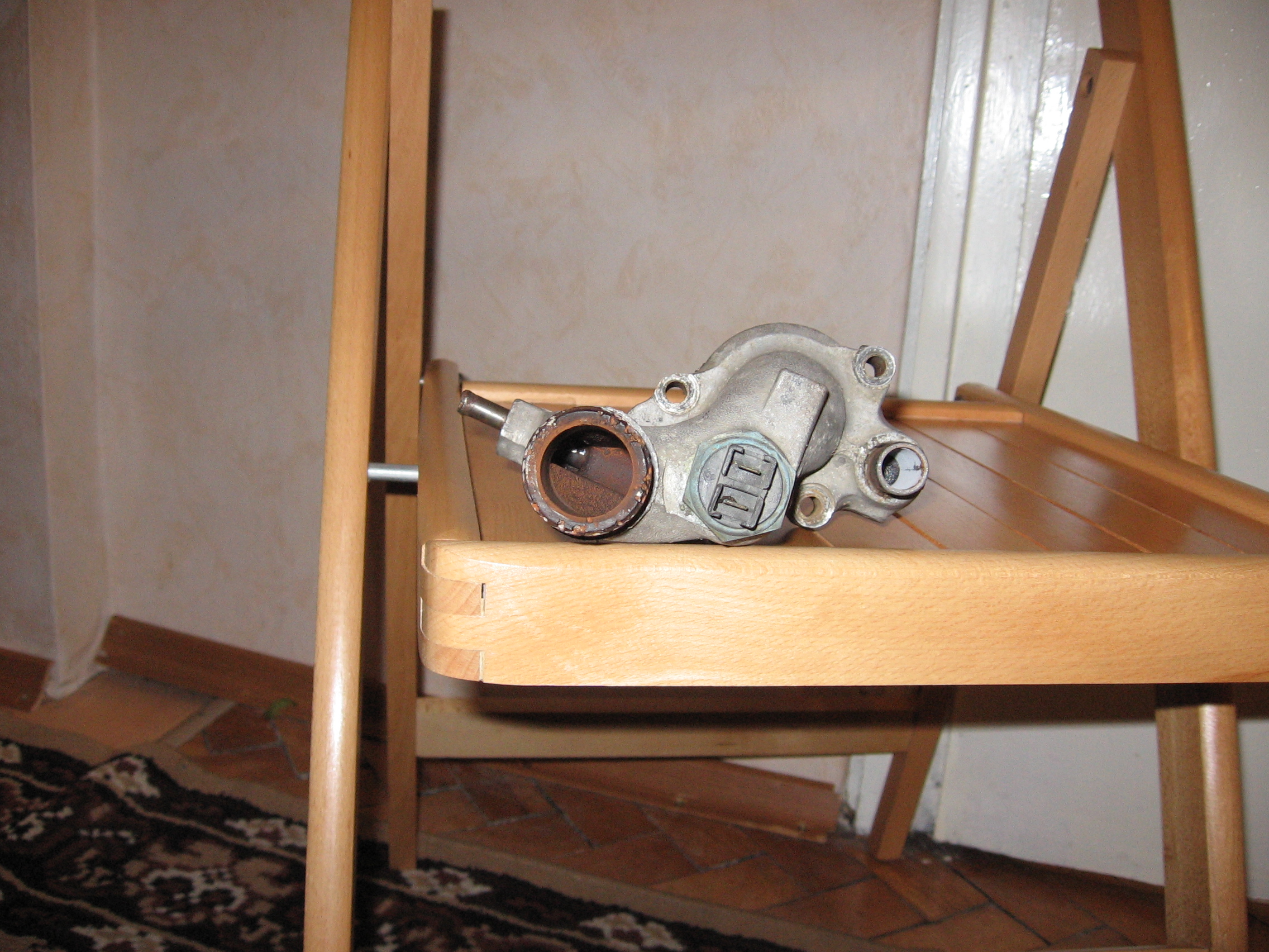 Имам предвид, че като пусна вода през големия отвор (за маркуча към радиатора) и термостата си е поставен(на смимките го няма) излиза вода през дуплата със стрелката