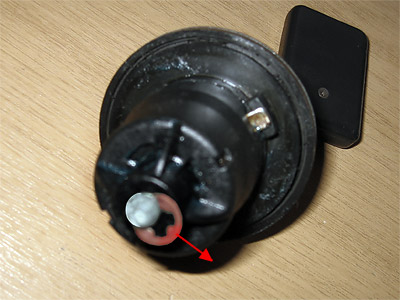 3 стъпка - След като свалите патрона започвате обилно да пръскате със смазочен спрей, през отвора за ключа и този показан с червено. Аз в случая ползвах и 1 игла и внимателно изваждах купища кал и боклуци от отвора с червено. Пръскате и въртите с ключа ..