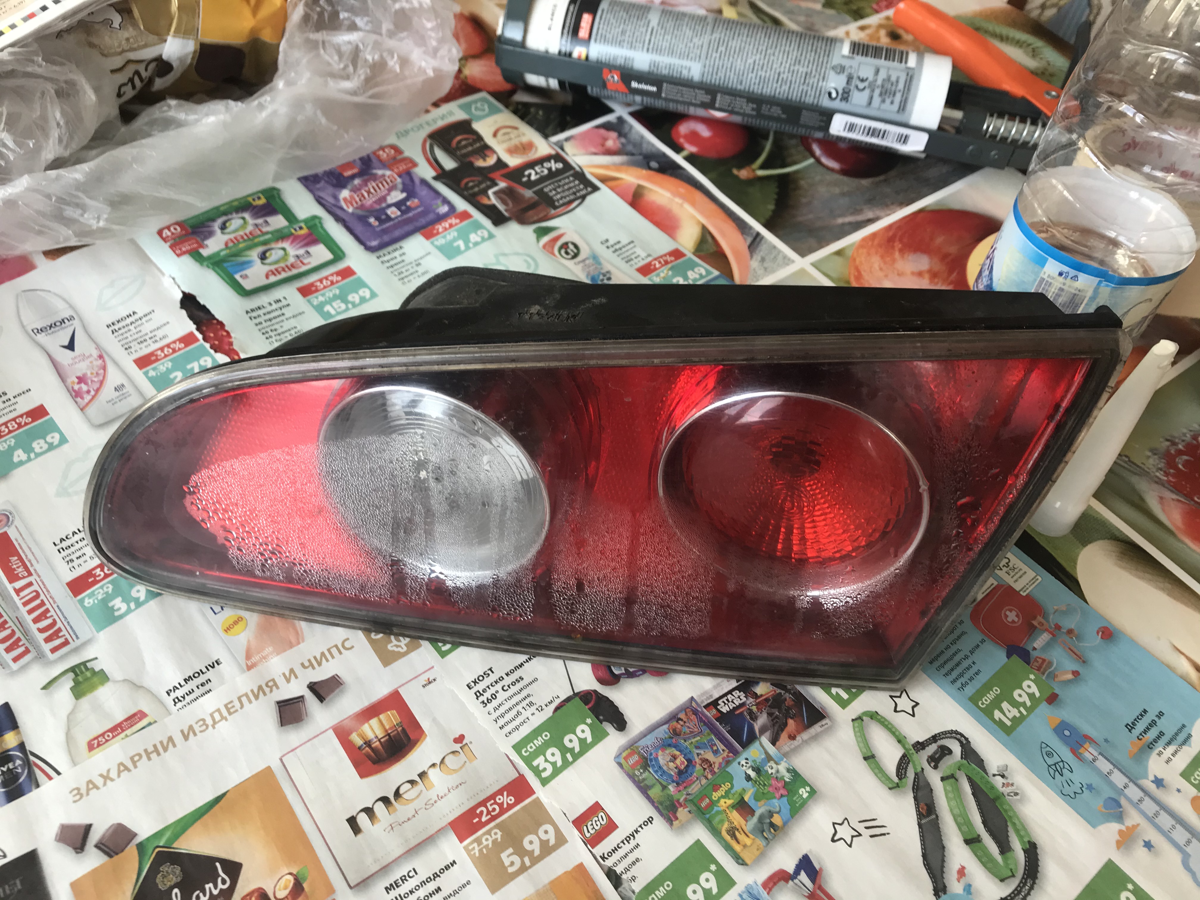 Втория стоп се спука на 2 места мъничко, тъй като пластмасата не беше издържала слънчевите лъчи толкова години и беше счупена/напукана в единия край. Тези пукнатинки също обмазах със силикон вътре и вън тъничко, така че да е само като прозрачен филм, невидим ако не си го завреш в очите.