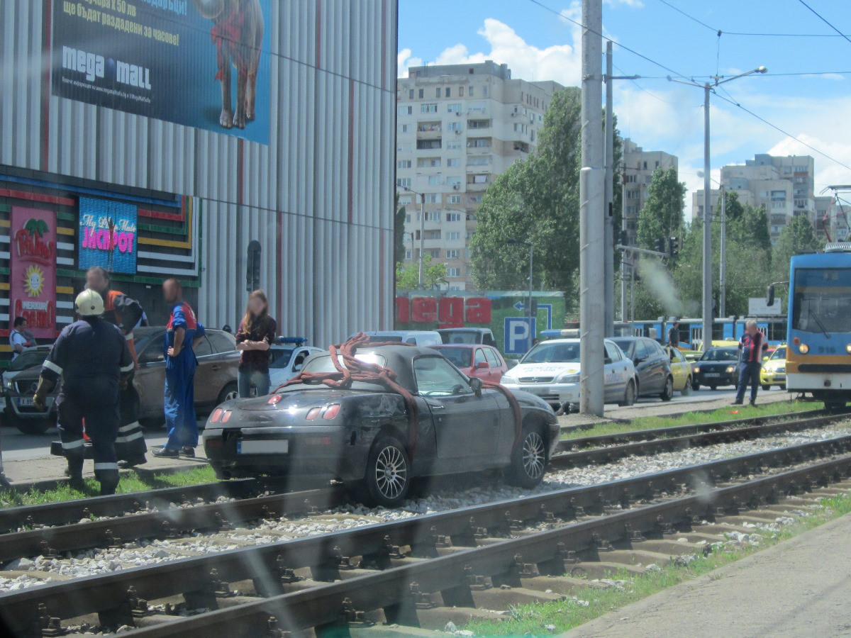 Поредният танц на автомобил върху трамвайната линия - срещу OMV Люлин. Днес малко преди три следобяд.