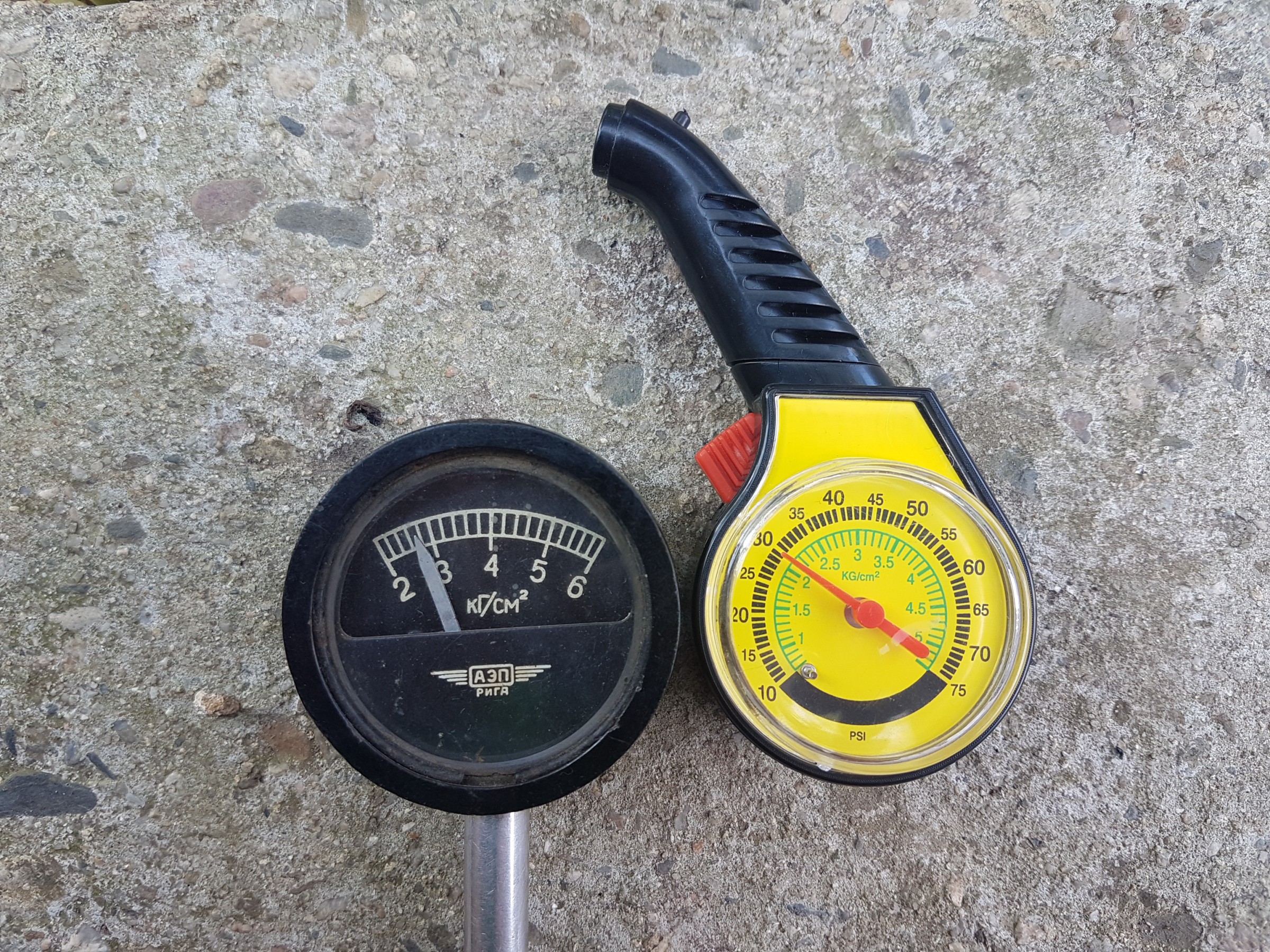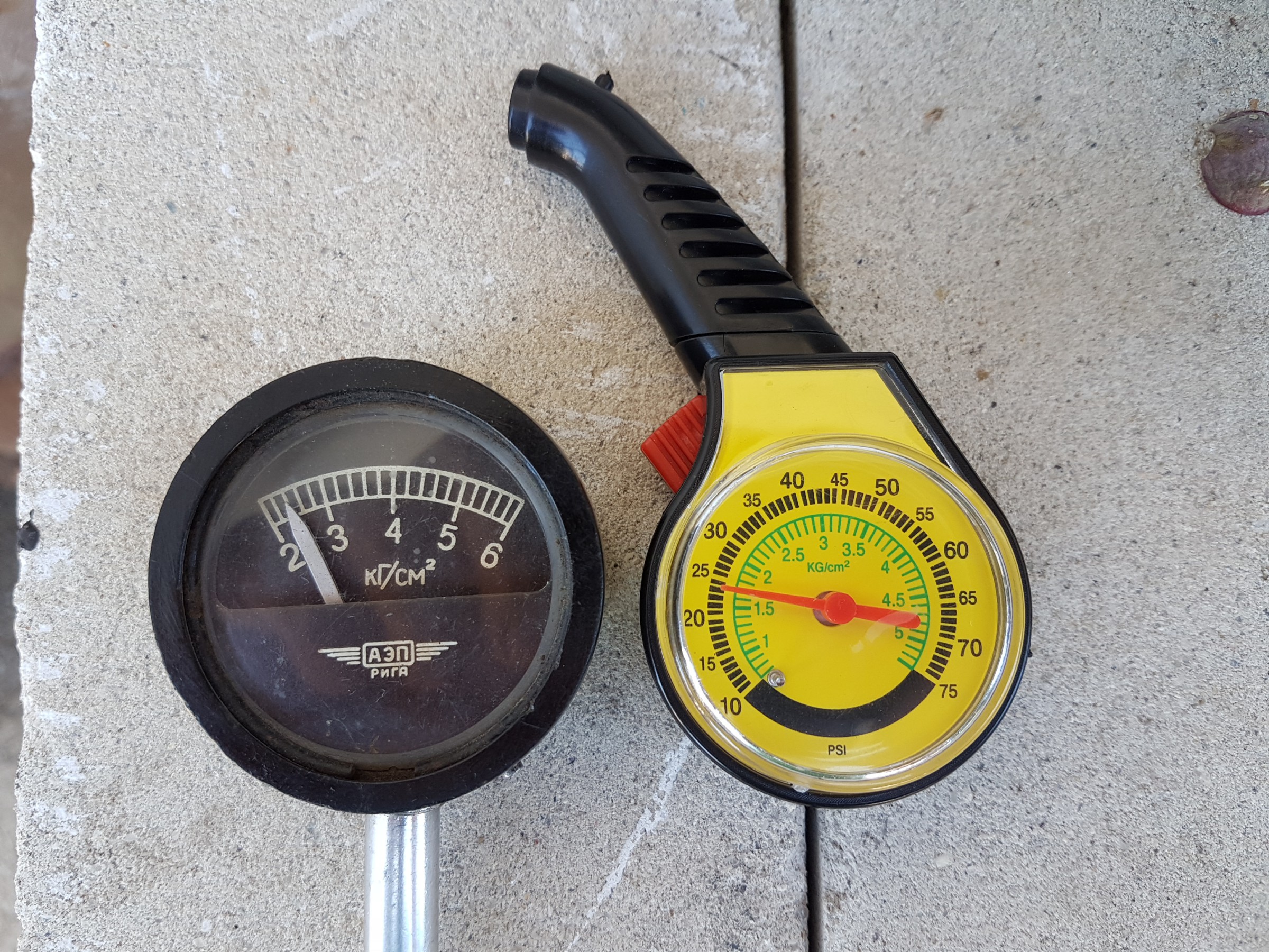 EDIT: Пускам снимки за да сравните какво показва стар руски манометър ( за тежкотоварни автомобили ) и този от МЕТРО при едно и също налягане: