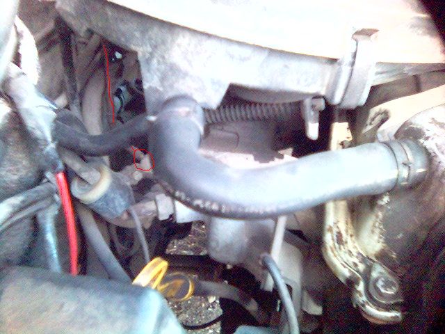 та така колеги... когато писах че ми трябва схема на моноинжекциона исках да разбера за какво е маркуча който на снимката липсва но съм го отбелязал с червено. мислих че е вакуум но когато го извадих се оказа че е за мокро. от долният конектор потече вода което ме навежда на мисълта че е за охлаждане на моноинжекцията...