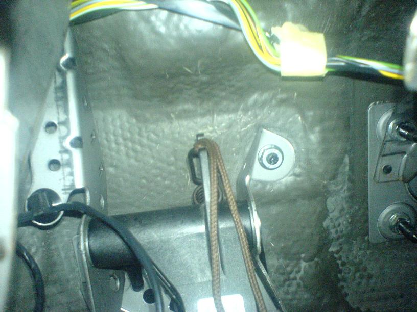 4. Когда короткий конец "на месте" левой рукой накидываем петельку от шнурка на длинный конец. Шнурок продеваем в проволочную проушину под рулевым, натягиваем и заматываем на педали сцепления потуже.