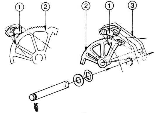 №1 е хванато в педала №3 също като пружинката, която натиска №1 към тресчотката №2