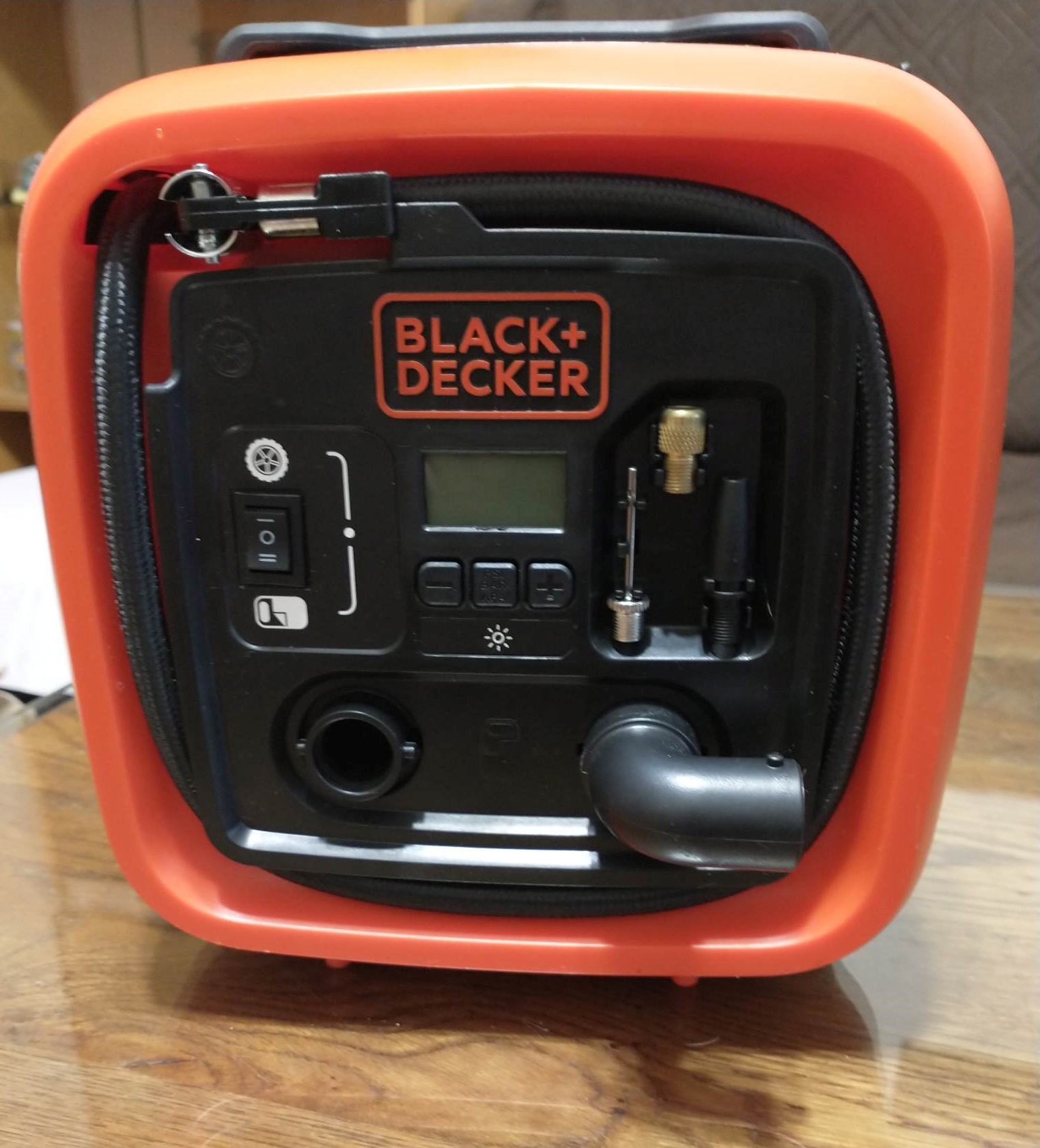 Около 20/20 см е, с дебелина 10 см. Отпред изводите са за надуване на дюшек. Нагласяват се атмосферите, и като достигне налягането сам се изключва, 99 лева.