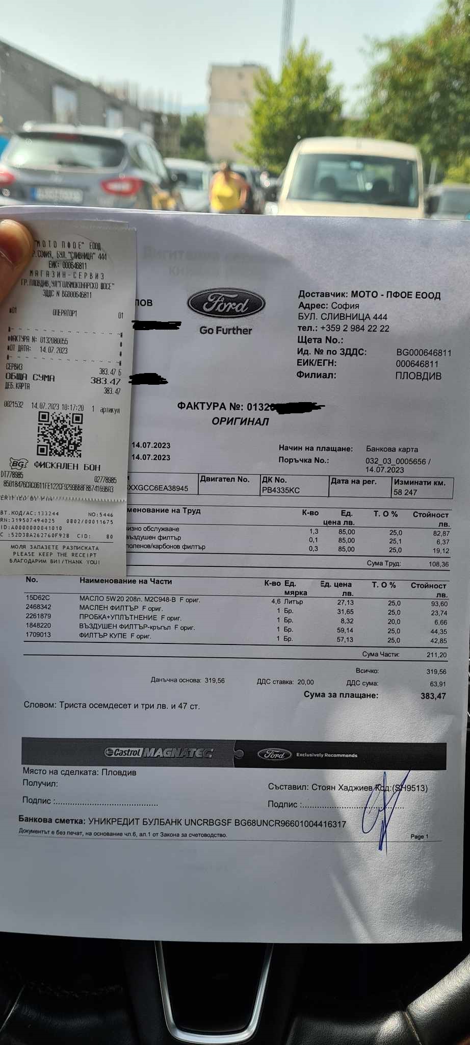 За пореден път и на пук, на всички разправящи, че заводските сервизи надуват грандиозно цените... аз съм доволен от МотоПфое, както и изненадан от цените им както на закупен от тях, оригинален, заводски артикул, така и от обслужването им! Фокусника беше със заводския си акумулатор Варта, на 8 години, никога не е сменян откак колата е произведена и от 2 месеца " Старт - Стоп " системата не функционираше... като беше ясно, че проблема е точно защото батерията е тръгнала да заминава и няма достатъчно ток ( държеше едва 30на процента ), за да функционират всички системи и екстри по колата, ако компа включи и " Старт - Стоп-а ". Същия се оказа, че не съществува при никой производител на батерии и няма как да се закупи със заводските, Фордови параметри, тъй, като се произвеждат само и единствено за тях, по техни спецификации, и дори от Варта нямат, и не могат да продадат акумулатор със същите параметри. Най-близките заместители, както на самата Варта, така и на другите производители, на висок клас със сходни параметри излизаха от порядъка на 220-250 лв, без смяната и без закачане на заводски софтуер, за да се калибрира компа на колата с новия акумулатор. В крайна сметка реших да не се занимавам с глупости и си отидох директно във Форд МотоПфое, където без предварително записване, запазване на часове, заявки и прочие... за 20-30 минутки ми извършиха всичките нужни манипулации и ми го смениха, с техен, заводски, едно към едно с този, който бе сложен на колата при производството и. Целия " филм " излезе крайна цена 316 лв, но след, като върнах на вторични стария... всъщност всичко ми излезе 295 лв, което е само с 50на лв разлика от афтърмаркет изделията и определено не смятам, че си заслужава, да купувам такива заместители и да ми ги слагат по кварталните гаражи, вместо в оторизирам, фирмен сервиз. Та така... колицата вече е и с нова батерия, " Старт - Стоп " системата отново функционира безупречно, а за капак и оборотите на колата се вдигнаха със 100на на 900 при празен ход, тъй, като стария е товарил вероятно и генератора, и оборотите бяха със 100на надолу от тов,а което трябва да е, и е с новия в момента.