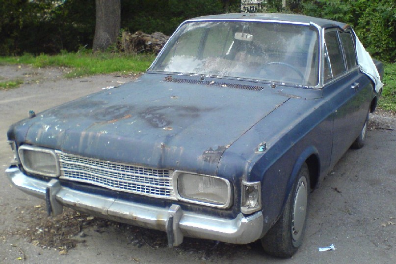 Ето Ford Taunus 1600 седан 1970 - 74, вероятно модификация XL. Не е точно изоставен, има си регистрация, но явно не се кара, на трупчета е отзад, отстрани в дясно е неприятно ударен, салонът е в прилично състояние, няма липси отвън.