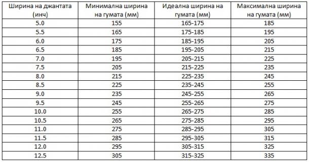 Съчетаване на размерите на гумите и джантите