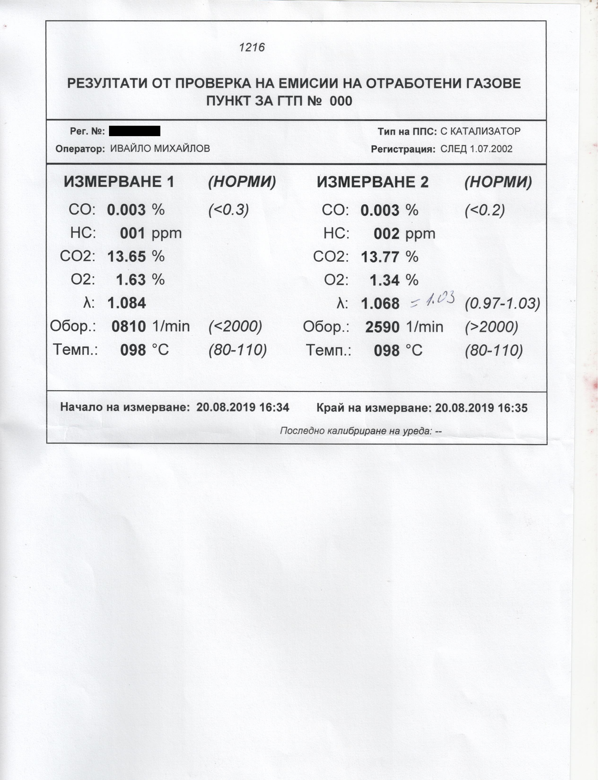 Закарах колата в друг пункт за ГТП и помолих да ми премерят газовете. Направиха ми разпечатка. Казаха, че няма никакъв проблем с изключение на ламбда, която била малко завишена - трябвало да е до 1.03, а при мен е 1.068. Твърдят, че това не било съществено. Прилагам разпечатката