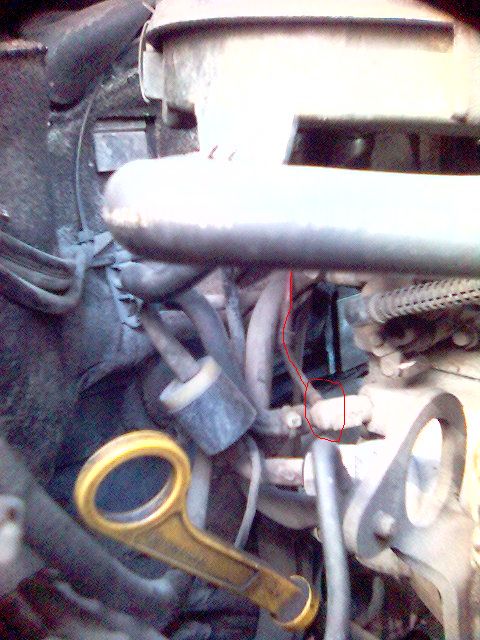 та така колеги... когато писах че ми трябва схема на моноинжекциона исках да разбера за какво е маркуча който на снимката липсва но съм го отбелязал с червено. мислих че е вакуум но когато го извадих се оказа че е за мокро. от долният конектор потече вода което ме навежда на мисълта че е за охлаждане на моноинжекцията...