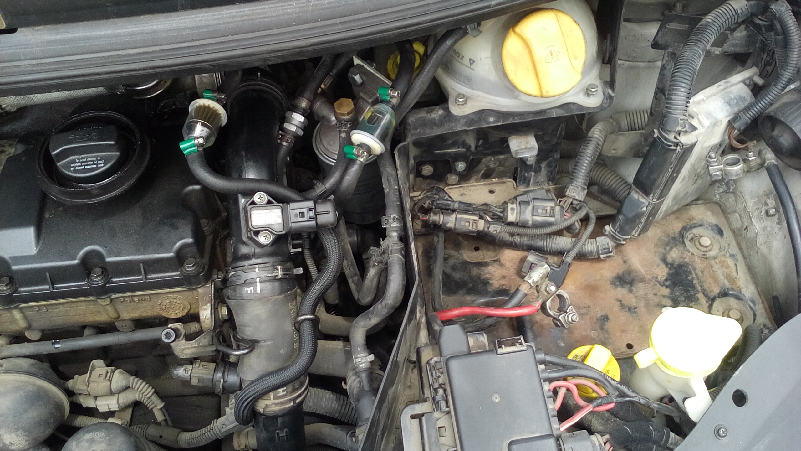 Дойде момента и скочих върху двигателя. Първо извадих въздушния филтър. Всички тръби към него както и S образната тръба на изхода на картерната вентилация. След това извадих тръбата от изхода на интеркулера към ЕГР-а. От страна на ЕГР-а се маха като се издърпа една телена скоба. Не съм снимал това разглобяване защото се оказа, че зад двигателя е голяма смрад и нямаше възможност да се мия постоянно. От ЕГР-а и от вентилацията на картера е избивало масло. Оляло е всичко и се е налепило с пепеляк. Силно препоръчвам ако не правите този ремонт по спешност като мен на поляната да идете със свалени капаци на мотора на автомивка и да измиете с обезмаслител всичко по капака на клапаните и отзад до където стигнете. За съжаление Галаксито е особено неблагодарно за работа в това отношение. От своя страна аз съм много едрогабаритен. Едва успявам да обгърна мотора и да бръкна с ръце от двете страни. За да развия всички болтове на капака на клапаните се наложи да сваля и ЕГР-а който е комбиниран с една дроселова клапа за меко гасене. Държат се на 3 шестограни болта. Вижда се само един. Другите с напипване. Наложи се от лидълския комплект да отрежа едното рамо на дръжката на един шестограм за да мога да въртя докато развивам. Естествено сваля се и нафтовия филтър и всички тръби покрай него. Сигурно щеше да е по –лесно ако бях свалил и разширителния съд, акумулатора и кутията му, но като си спомних само каква хамалогия беше и там и ми мина всякакво вдъхновение. Според колеги от Ауди форума работата по смяна на дюзите била два часа, а аз два дена разглобявам. На края свалих капака.