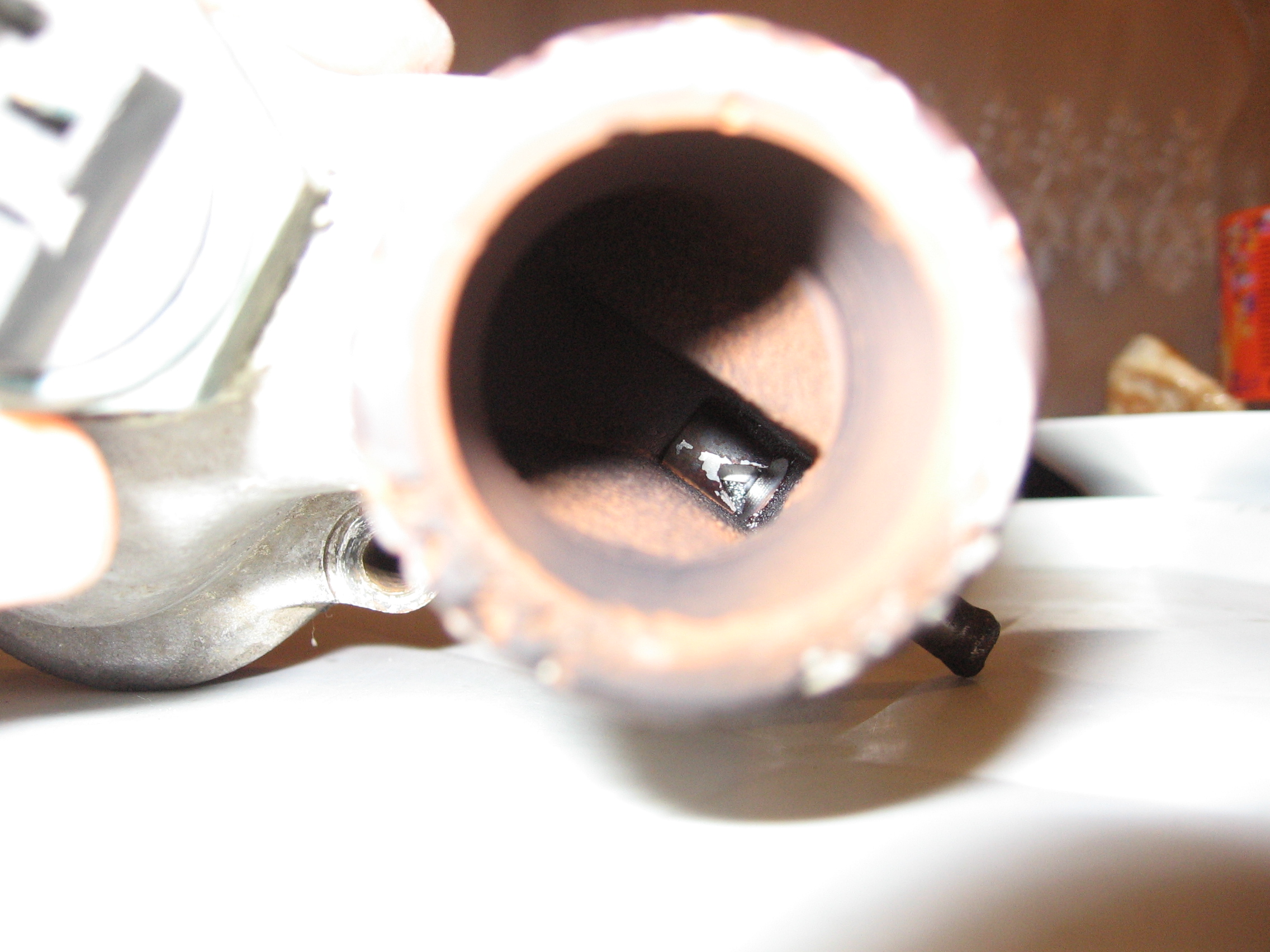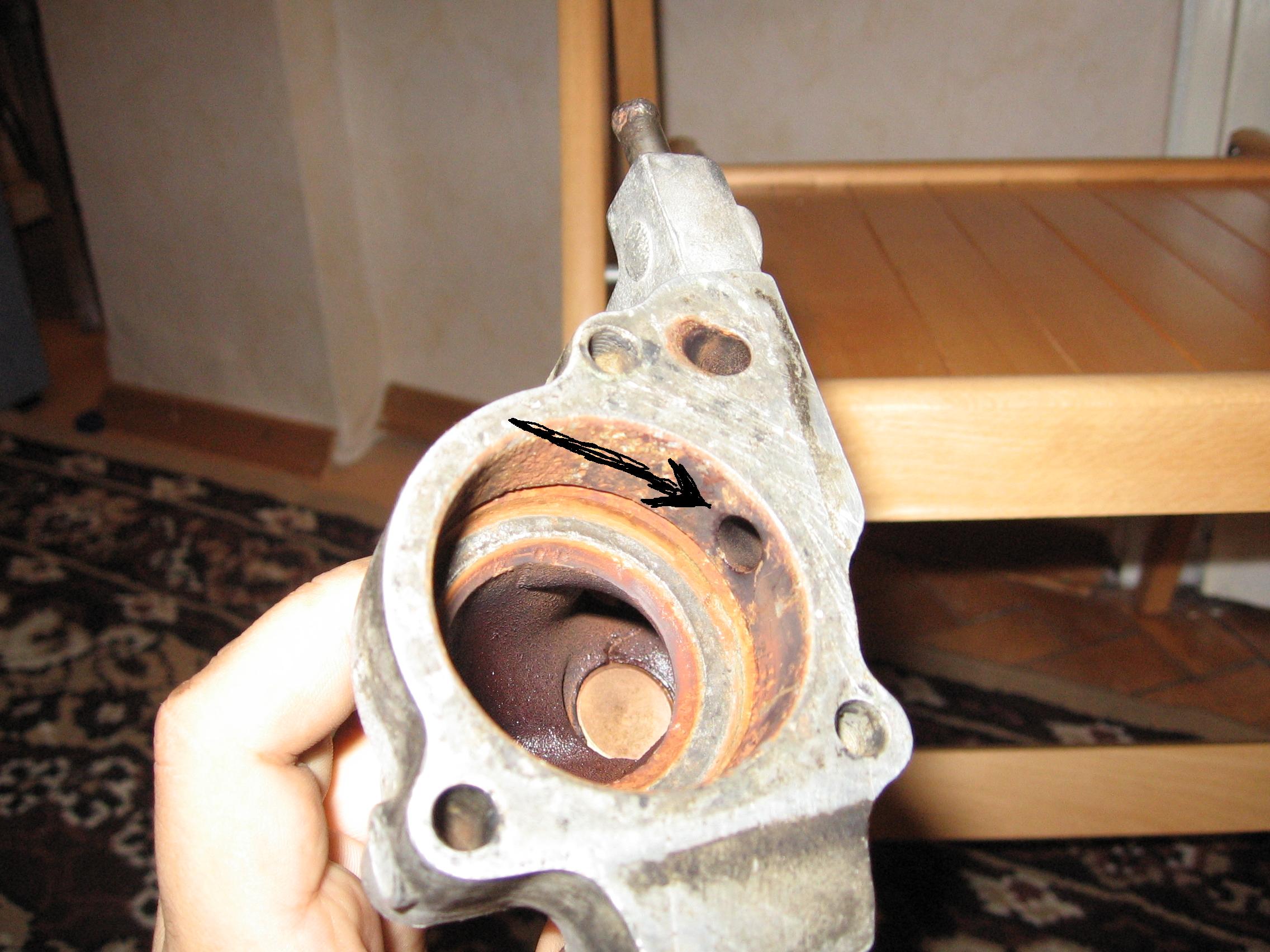 Имам предвид, че като пусна вода през големия отвор (за маркуча към радиатора) и термостата си е поставен(на смимките го няма) излиза вода през дуплата със стрелката