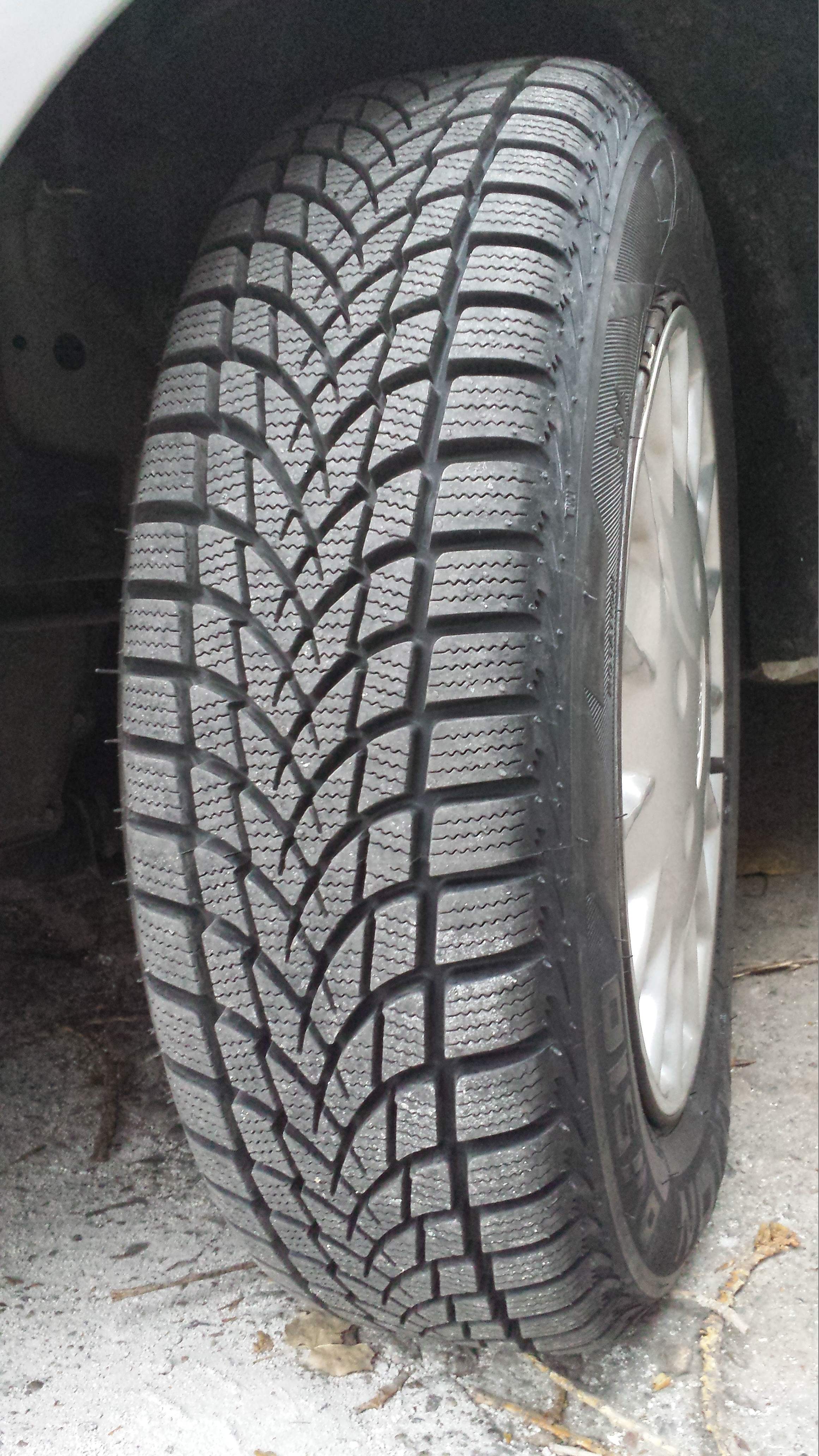 - Купени и сложени 4 чисто нови, зимни гуми от магазина - Дайтон ( произвеждат се от Бриджстон ) с размер 155 / 70 /13. Монтирах ги на оригиналните, железни джанти, които са с оригинални, заводски тазове на Форд.