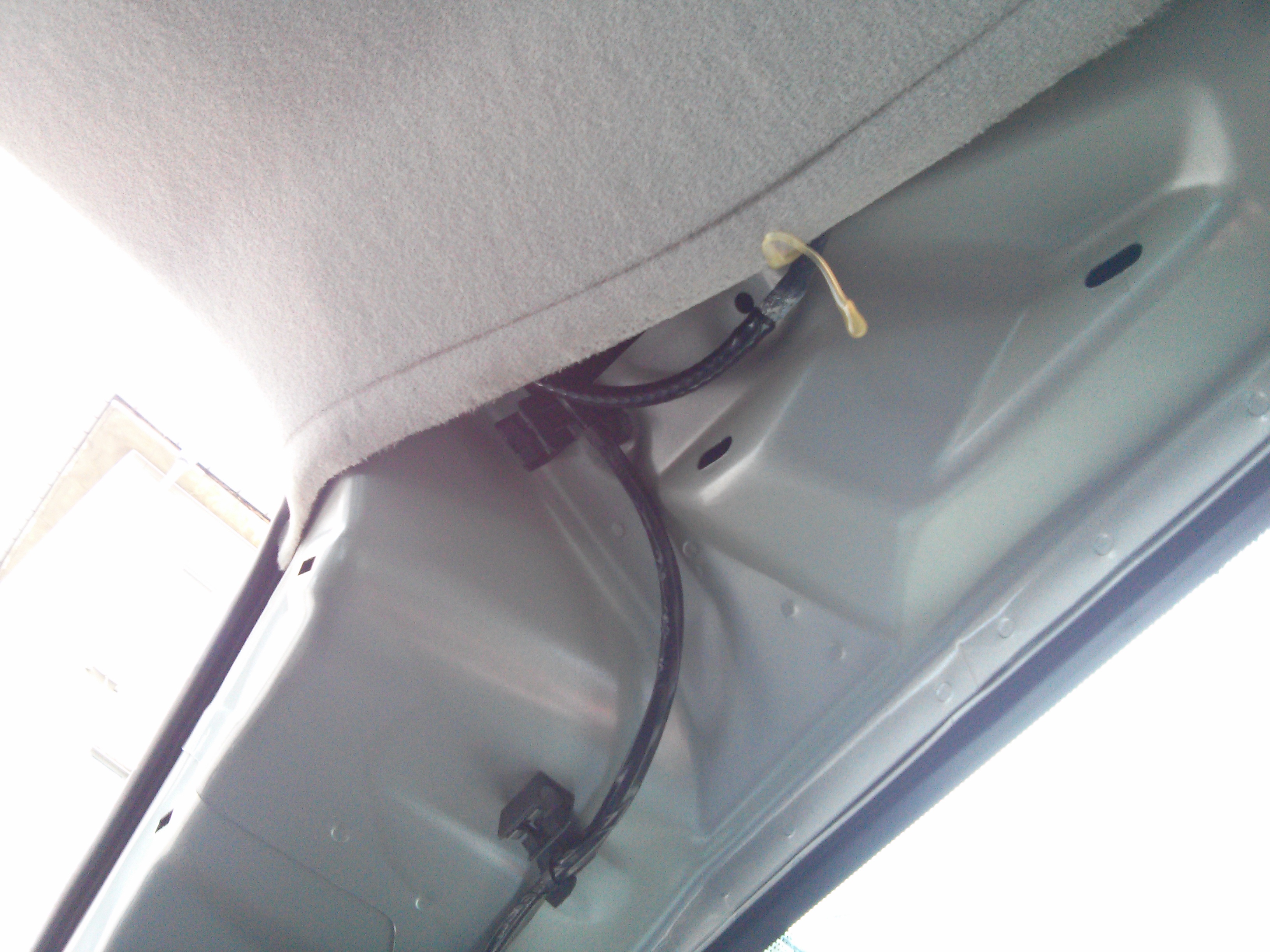 За да се открие достъп до него, трябва да се свали пластмасовата кора на задната колона. Обаче за да се свали тя, първо трябва да се свали (по скоро отмести леко) пластмасата над машинката на колана: Наставката е точно над триъгълното прозорче: Още като го разкачих ми направи впечатление че пръсна няколко капки, което е добър знак че течността стига до там: Съединението представлява това (вътре има съчма и пружинка): Естествено запушено: След малко почистване с една игла, ето това излезе от него: Добре че преди да го сложа обратно, реших да пробвам дали течността стига до тази наставка: