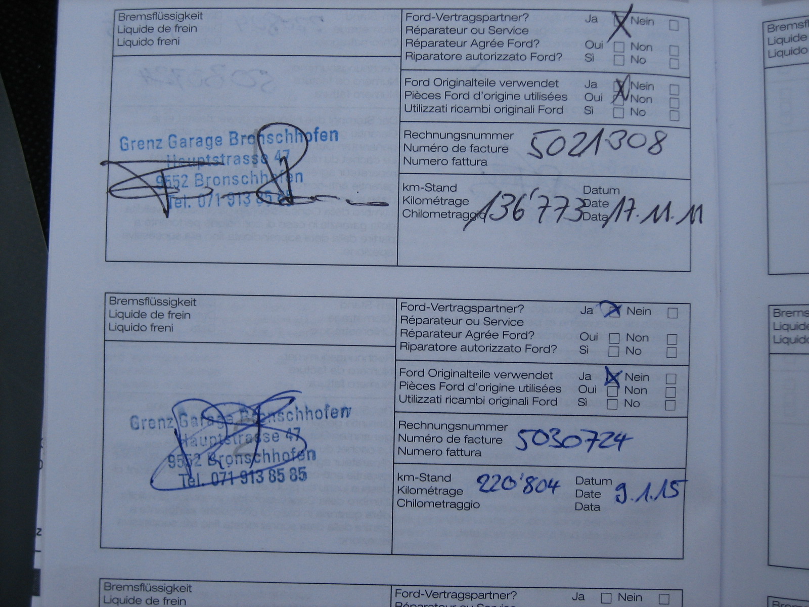 Поне тези полета е написал, който е попълвал книжката. Да не те заблуждават различните цветове и опити за различни подписи, книжката е попълвана от един човек (ако се съди по изписването на 0, 1, 2, 5 и 7 от снимка 3) и вероятно на една и съща дата, ± няколко дни от превъртането на километража. Ти си решаваш, дали да се притесняваш.