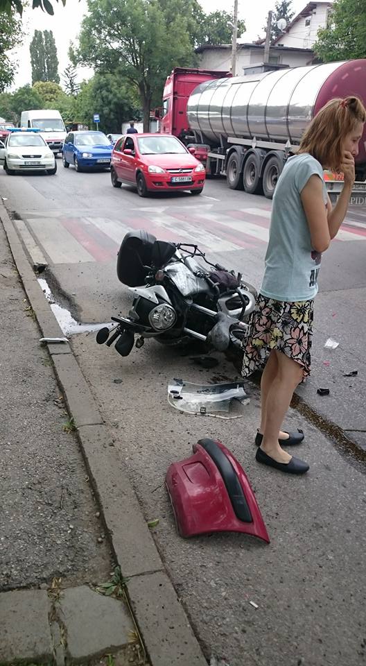 Днес на околовръстното.... Жената се опитва да избегне удар с ТИР-а, удря се в левия стоп на ремаркето, колата отива в насрещното и удря челно моториста. Спряхме аз и още една кола, преместихме моториста от платното за движение. Добре е моториста, има най-вероятно фрактура на лявата ръка, но е добре