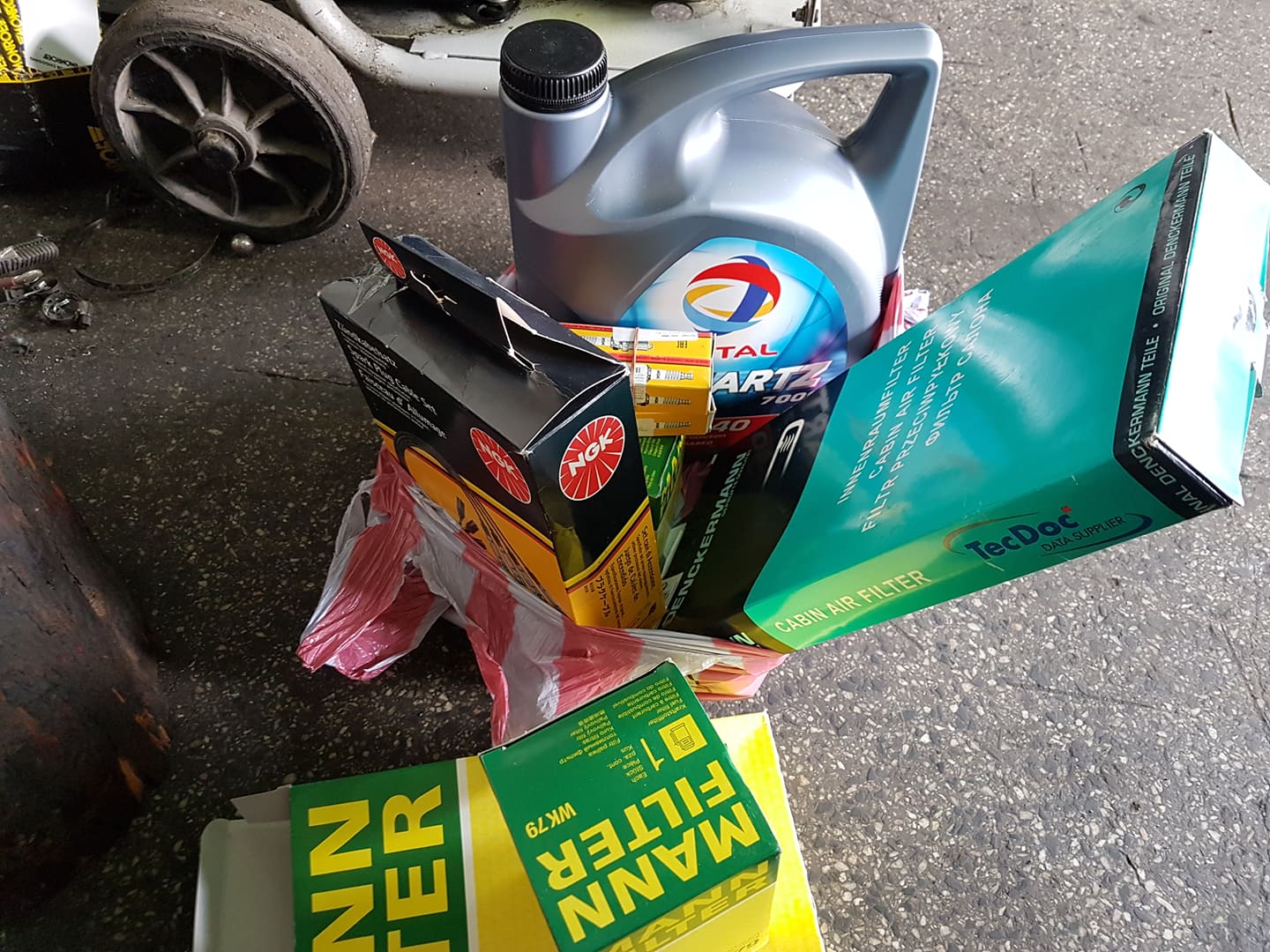Масалцето... обичайното Тотал 10 в 40, 5 литра туба, 3 филтъра на МАН - въздушен, горивен и маслен, карбонов филтър купе на Денкерман, Оригинален филтър Ландиренцо на газовата, кабели и свещи на NGK Цена - 190 лв всичко.