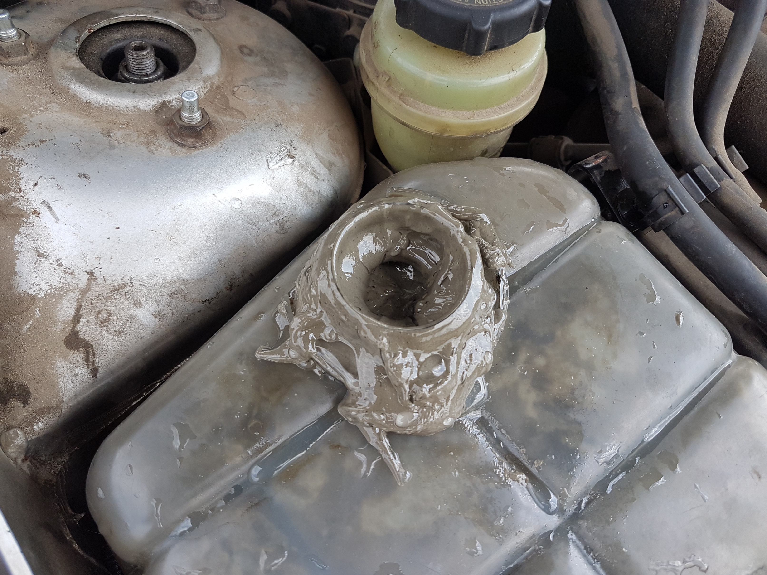 На теория, за обезмасляване при по-висока температура, препарати за съдомиялна би следвало да имат най-голям ефект и до колкото са environmental friendly, не би трябвало да увредят гумените части. Тънките маркучи и радиатора на парното задължително трябва да се продухат с компресор предварително - налягането от помпата не може да избута кашата, установено на практика с Мерцедеса на един колега. Източва, промива с Radiator Flush два пъти и колата пак загряваше, защото маркучетата за обезвъздушаване от главата и радиатора към разширителния съд се оказаха затапени. От парното излезе още към половин литър каша като тази от снимките, въпреки промивките.HACKO написа: ↑21 сеп 2017, 14:23Има мнооооого по-добри обезмаслители от Меглиото. Аз го слагам в отрицателната част на скалата, за мене Меглиото е хвърлени на вятъра пари. Маркучите не би следвало да се раздуят от маслото, все пак са маслоустойчиви, но за да се почисти ще трябва да се свалят. Същото трябва да е и в блока и радиатора на парното, не знам оттам как ще го изкарате.