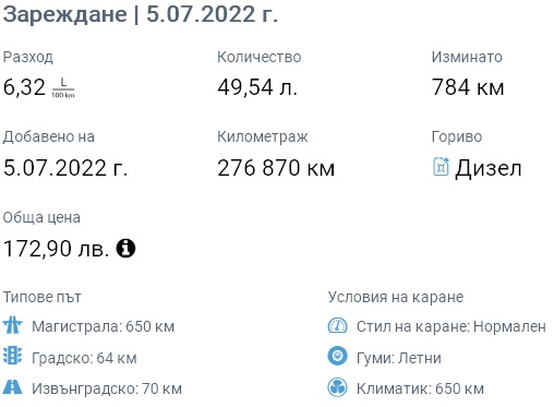 Харманли-априлци-харманли през шипка.6,05 на колонка-6,9 на борда.мисля че е добре.400км