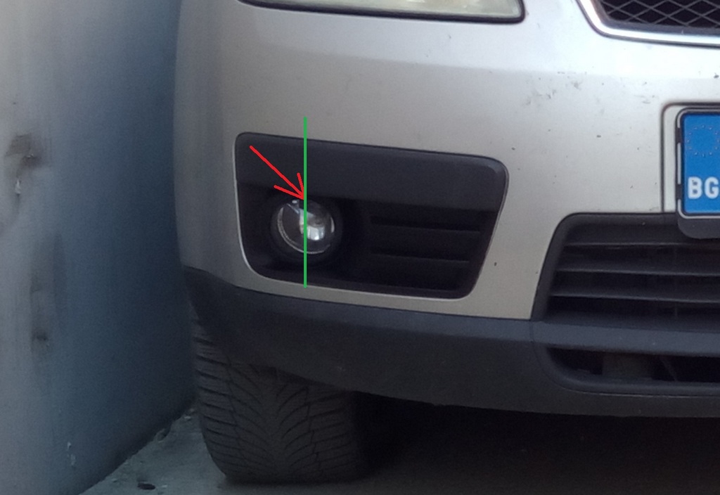 На Ц-Макс МкI и Фокус МкII има винт, който е достъпен от външната страна, главата е тънък шестограм 2,5 или 3 мм. Намира се в средата на халогена, по вертикалната ос (зелената линия), само не помня със сигурност от горе ли беше или отдолу. Може да се нацели, без да се сваля декоративната решетка, но най-удобно е, като се свали въпросната. Та огледай, ако е нужно свали някоя декоративна пластмаса.