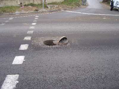 минавам аз с смешна скорост и даже намалих за да се посмея на счупения на две капак на шахтата. може би това е дуг, непревидим дефект? или всъщност май у много опасно място на един претоварен път