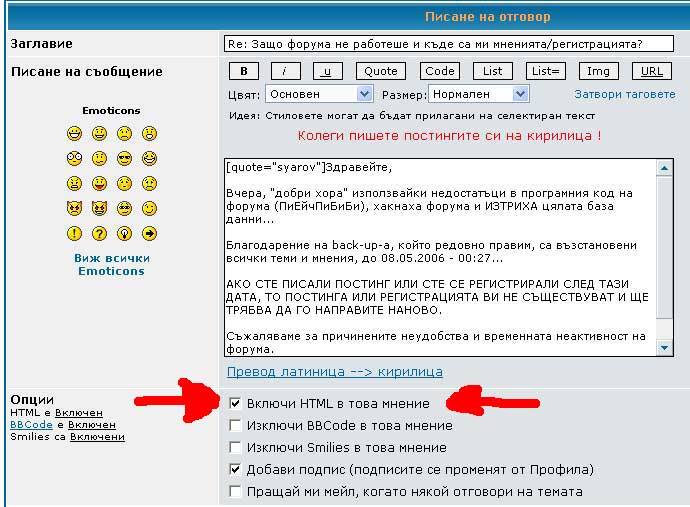 След инсталирането на новата версия на форума /след недоброжелателната атака/ има някой промени във функцията "Цитат" и "HTML"
